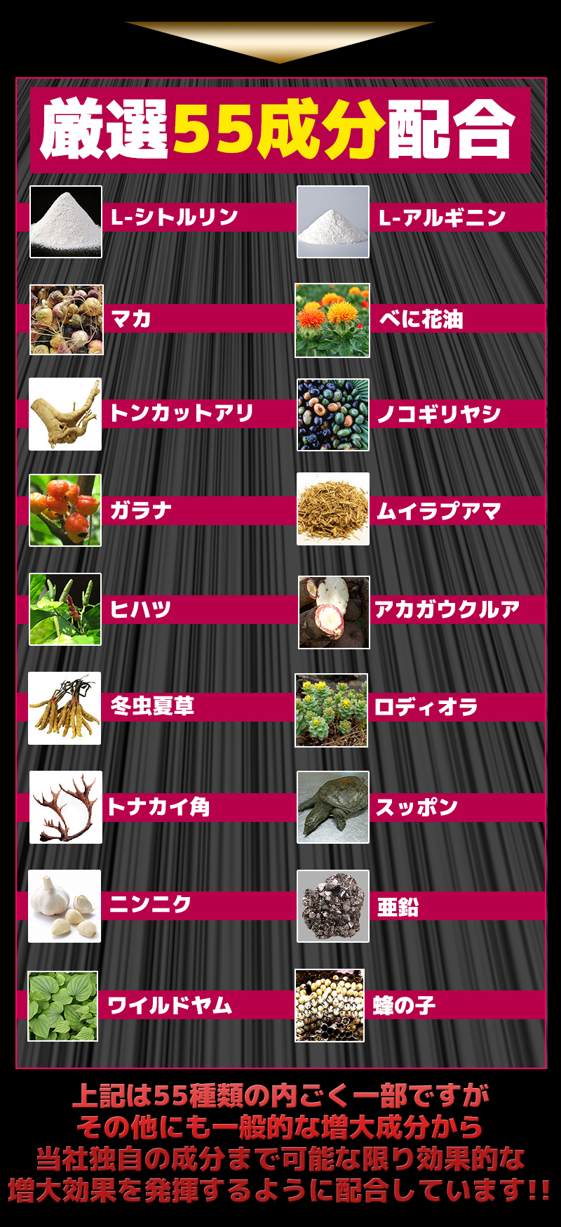 マカエキス末(国内製造)、べに花油、マムシ粉末、サソリ末、L-シトルリン、L-オルニチン塩酸塩、α-リポ酸、キダチアロエ末、亜鉛含有酵母、アリ末、アカガウクルア末、秋ウコン、ガラナ末、ニンニクパウダー、カロペプタイド(乳糖、オットセイ骨格筋抽 出物)(乳成分を含む)、γ-アミノ酪酸、ロディオラエキス、ガジュツ末、生姜末、すっぽん粉末、セージ末、田七人参、エラスチンペプチド、冬虫夏草粉末、フェヌグリーク種子抽出物、牡蠣エキス末、金時ショウガ末、グリーンコーヒー豆エキス、トンカットアリ末、トナカイ幼角末、高麗人参末、ノコギリヤシエキス粉末、ビール酵母、醗酵黒タマネギ、ヒハツエキス末、蜂の子粉 末、醗酵黒ニンニクパウダー、乳たんぱく質、ムイラプアマ(地上部)エキス末、ローヤルゼリー、ワイルドヤムエキス末/セルロース、活性炭、ステアリン酸カルシウム、微粒酸化ケイ素、クエン酸、L-チロシン、L-トリプトファン、L-ヒスチジン塩酸塩、L-ロイシン、L-アルギニン、L-バリン、L-イソロイシン、カフェイン(抽出物)、香辛料 |